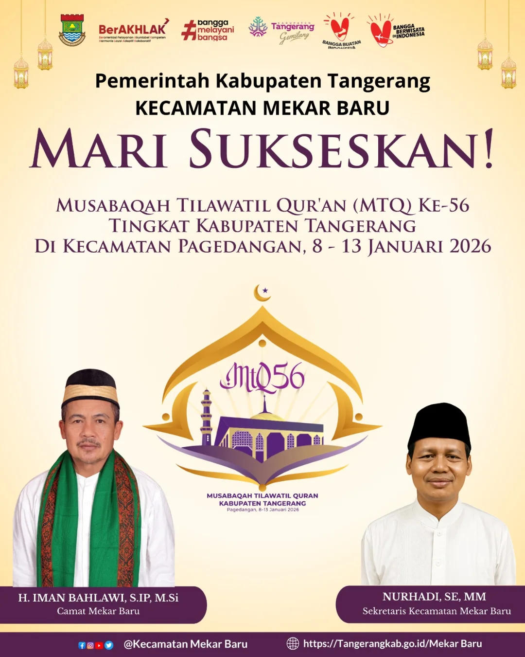 “MTQ bukan semata-mata ajang perlombaan membaca Al-Qur’an, melainkan sarana membentuk karakter masyarakat yang religius, berakhlak mulia, dan berlandaskan nilai-nilai Qur’ani. Kami mengajak seluruh masyarakat untuk turut menyukseskan MTQ ke-56 Tingkat Kabupaten Tangerang ini,” ujar H. Iman Bahlawi, Kamis (8/1/2026).