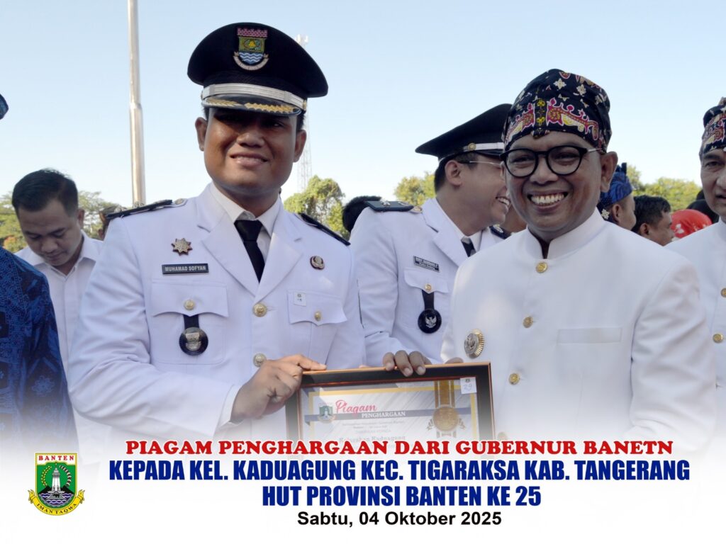 Penghargaan tersebut diserahkan langsung oleh Gubernur Banten, Andra Soni, S.M., M.AP., kepada Lurah Kaduagung, Muhamad Sofyan, S.STP., pada peringatan Hari Ulang Tahun ke-25 Provinsi Banten yang digelar di halaman Gedung Gubernur Banten, Sabtu (4/10/2025).
